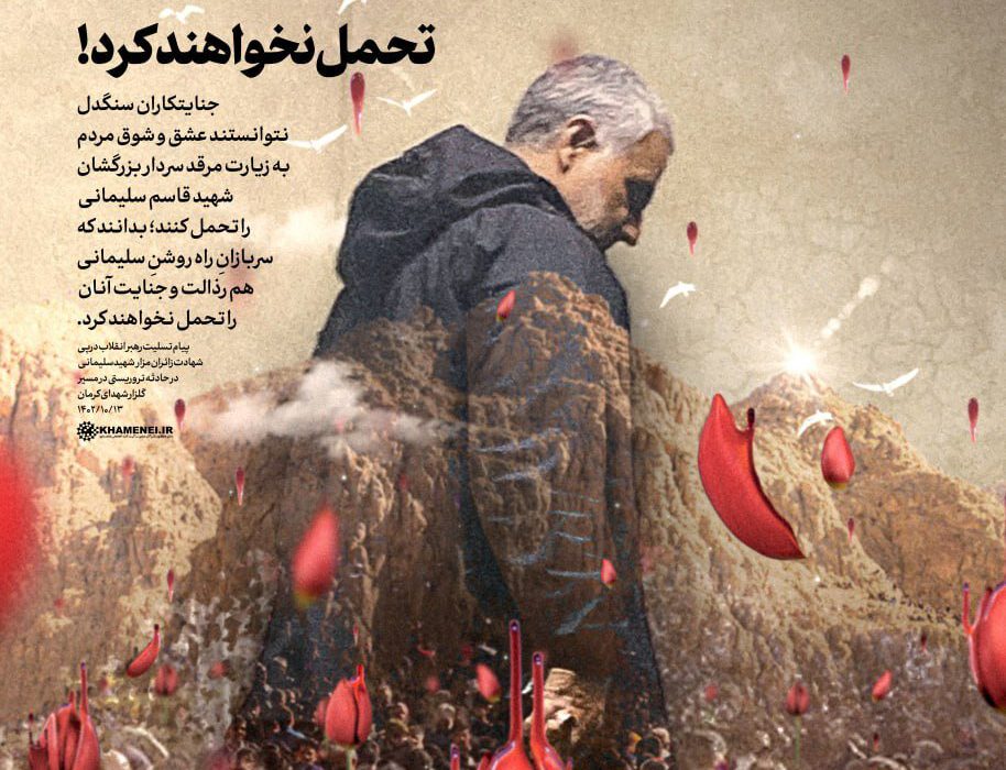 ملت ایران عزادار شد و خانوادههای زیادی در سوگ جگر گوشگان و عزیزان خود غرق ماتم شدند. جنایتکاران سنگدل نتوانستند عشق و شوق مردم به زیارت مرقد سردار بزرگشان شهید قاسم سلیمانی را تحمل کنند. بدانند که سربازانِ راه روشن سلیمانی هم رذالت و جنایت آنان را تحمل نخواهند کرد. چه دستهای آلوده به خون بیگناهان و چه مغزهای مفسد و شرارتزا که آنان را به این گمراهی کشاندهاند، از هم اکنون آماج قطعی سرکوب و مجازات عادلانه خواهند بود. بدانند که این فاجعه آفرینی پاسخ سختی در پی خواهد داشت باذن الله.»